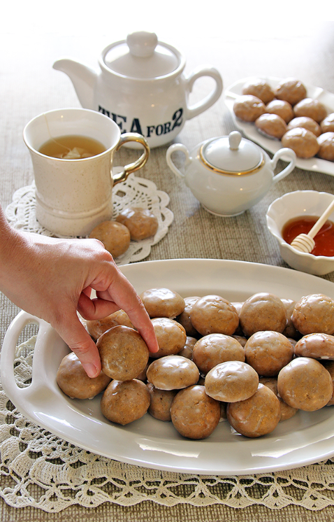 - שולפים את התבנית מהתנור, מחכים חצי דקה כדי שיתחילו להתייצב טיפונת וטובלים את העוגיות בעודן חמות בזיגוג אבקת הסוכר.