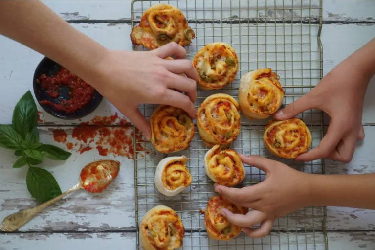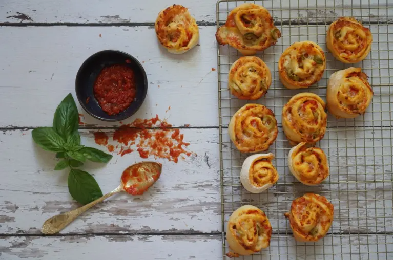 מורחים 1/4 מכמות המילוי, מפזרים זיתים וגבינה צהובה ומגלגלים לגליליה ופורסים פרוסות בעבי 2 ס"מ.