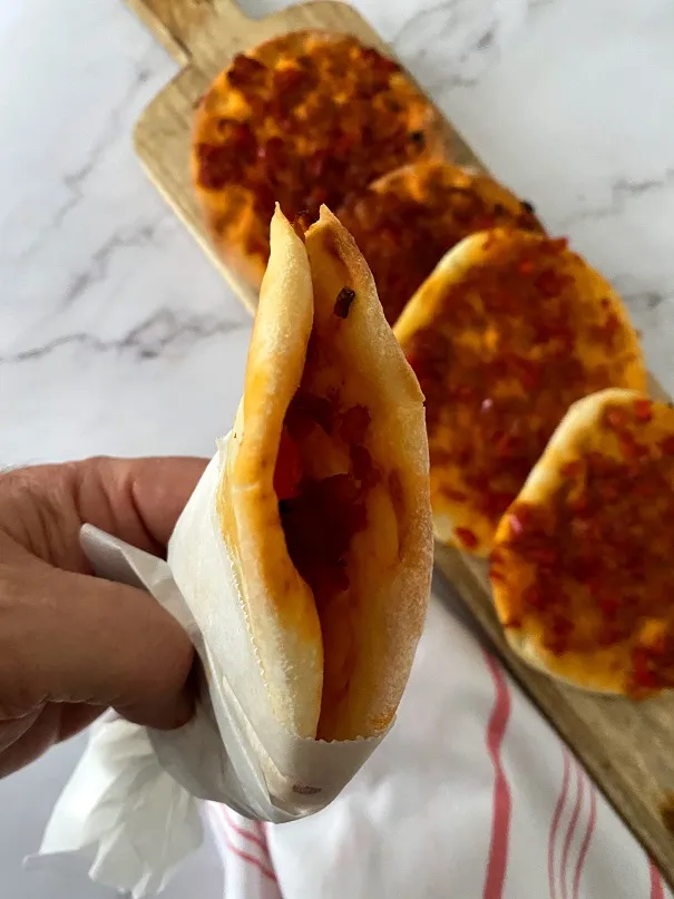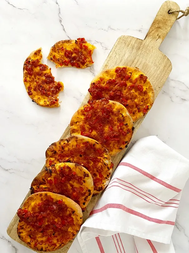 על כל עיגול בצק שמים כ-2 כפות של תערובת פלפלים (שהתקררה בינתיים) ומורחים אותה.